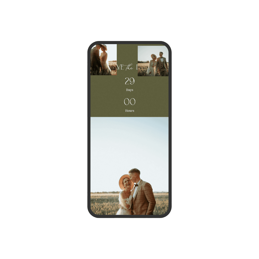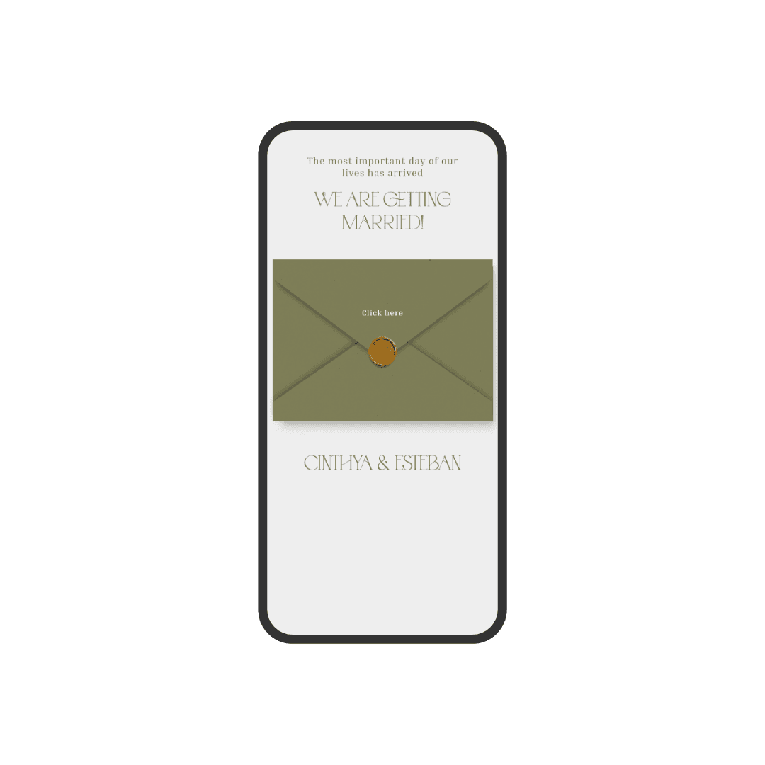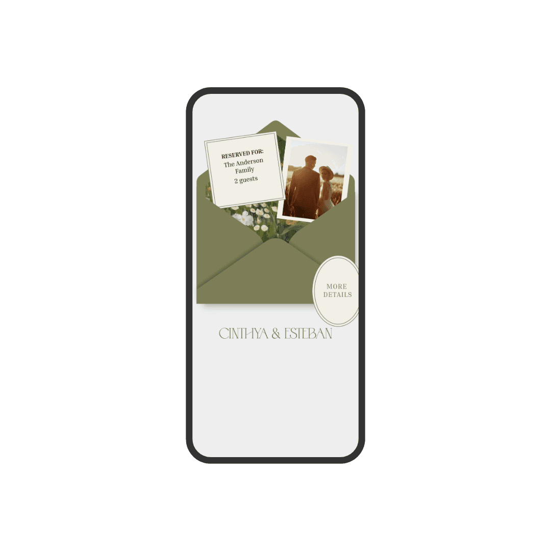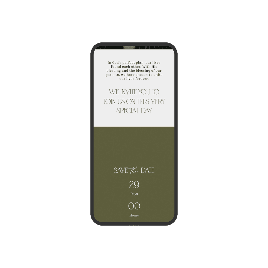 Verdant is an invitation designed in olive-green tones, featuring a modern and minimalist style that conveys natural elegance. Its soft textures and delicate animations create a harmonious and contemporary visual experience. An ideal choice for couples seeking a subtle, sophisticated invitation with a touch of nature.